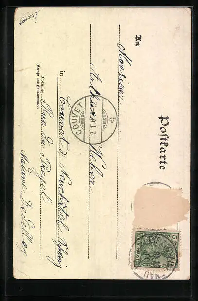 gelaufen 1900, Briefmarke entfernt, rückseitig Oberflächenschaden, Einriss re. oben, Eckknick unten re., guter Zustand
