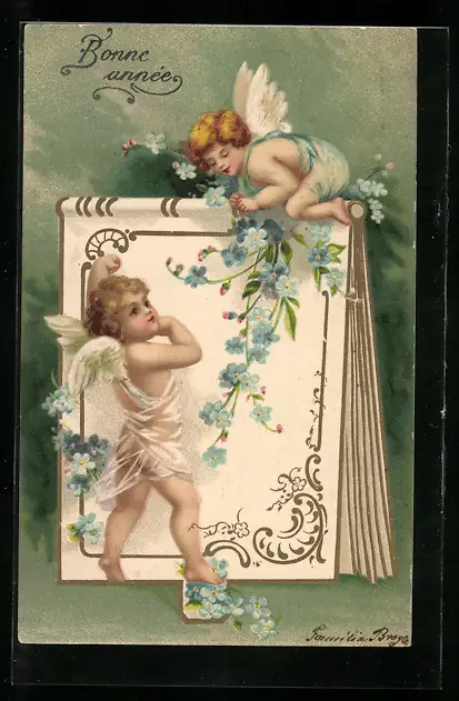 AK Neujahrsengel mit Vergissmeinnicht, Bonne année