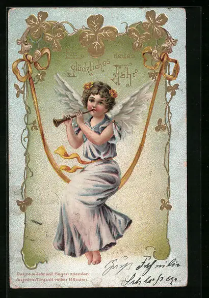 AK Neujahrsengel spielt die Flöte, Ein glückliches Neujahr