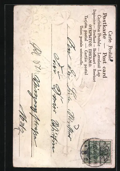 Personenbezogene Daten auf der Rückseite der Karte wurden durch blauen Textmarker unkenntlich gemacht. Die blauen Stellen sind auf die Vorderseite durchgeweicht und wirken sich negativ auf das Postkartenfoto aus