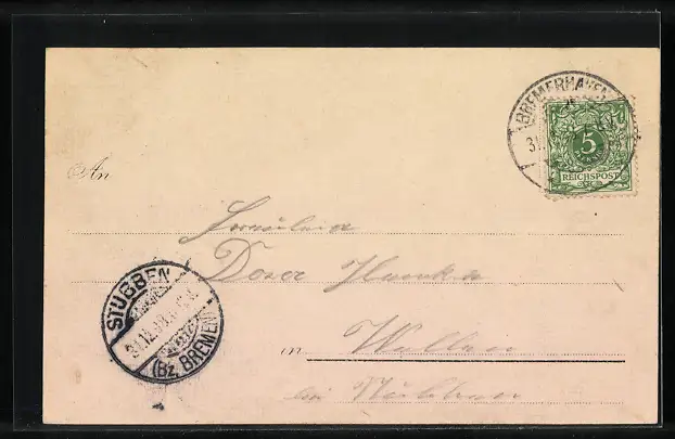 Personenbezogene Daten auf der Rückseite der Karte wurden durch blauen Textmarker unkenntlich gemacht. Die blauen Stellen sind auf die Vorderseite durchgeweicht und wirken sich negativ auf das Postkartenfoto aus