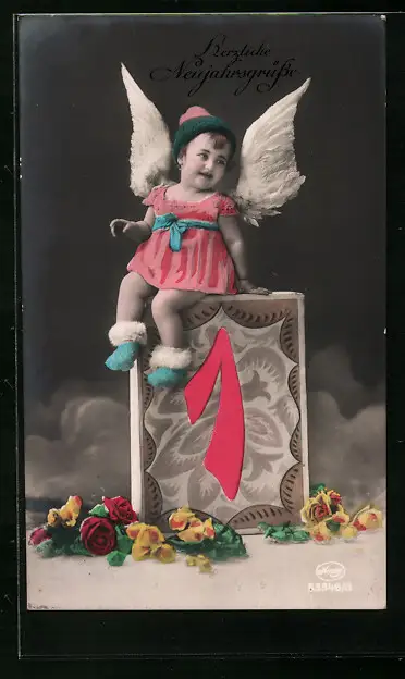AK Neujahrsgrüsse, Kleinkind als Engelchen