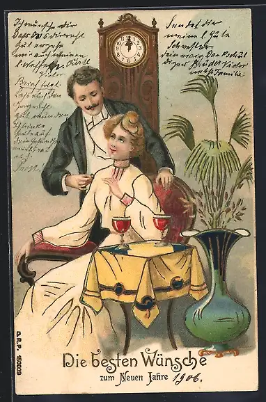 AK Neujahrsgruss, Paar sitzt mit Weingläsern vor einer Wanduhr