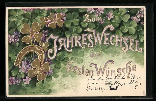 AK Neujahrsgruss, goldene Kleeblätter und Hufeisen