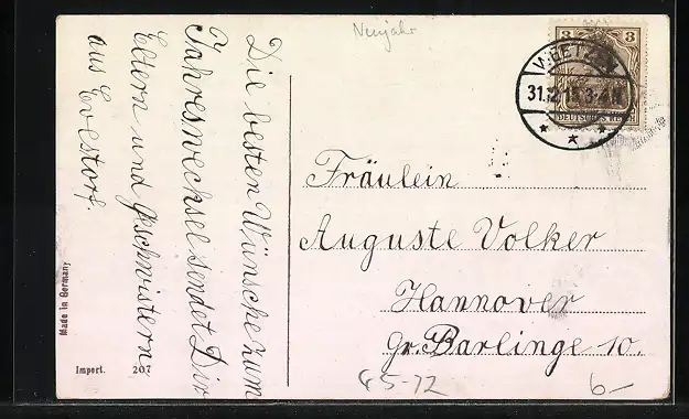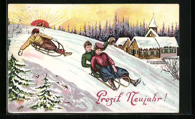 AK Neujahrsgruss, junge Menschen auf der Rodelbahn