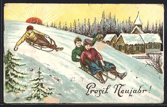 AK Neujahrsgruss, junge Menschen auf der Rodelbahn