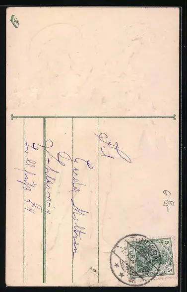 Personenbezogene Daten auf der Rückseite der Karte wurden durch blauen Textmarker unkenntlich gemacht. Die blauen Stellen sind auf die Vorderseite durchgeweicht und wirken sich negativ auf das Postkartenfoto aus