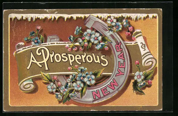 AK Neujahrsgruss mit Hufeisen und Blumen