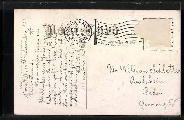 Personenbezogene Daten auf der Rückseite der Karte wurden durch blauen Textmarker unkenntlich gemacht. Die blauen Stellen sind auf die Vorderseite durchgeweicht und wirken sich negativ auf das Postkartenfoto aus
