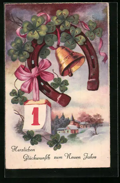 AK Neujahrsgruss mit Hufeisen und Glocke