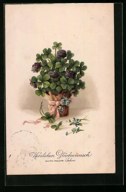 AK Neujahrsgruss mit Kleeblättern im Topf