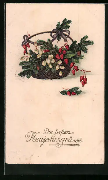 AK Neujahrsgruss mit Korb voller Pflanzen