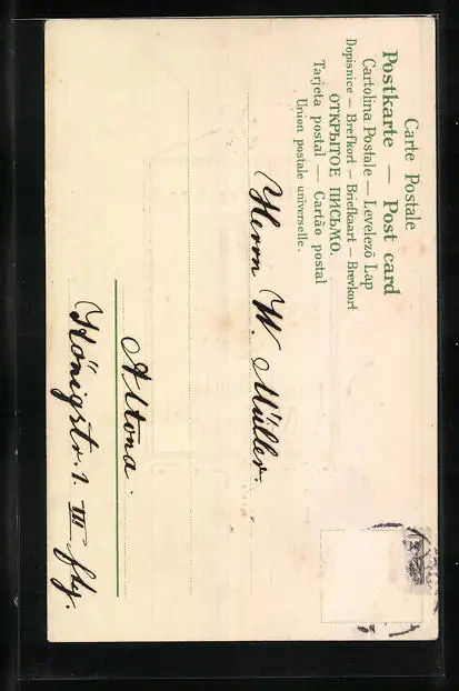 alte Ansichtskarte, gelaufen, Briefmarke entfernt, rückseitig Oberflächenschaden, Stempelspur, guter Zustand