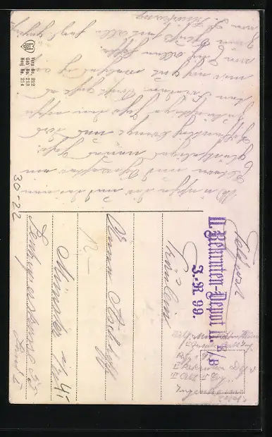 Personenbezogene Daten auf der Rückseite der Karte wurden durch blauen Textmarker unkenntlich gemacht. Die blauen Stellen sind auf die Vorderseite durchgeweicht und wirken sich negativ auf das Postkartenfoto aus