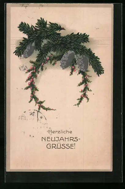 AK Neujahrsgruss mit silbernen Zapfen an Tannenzweig