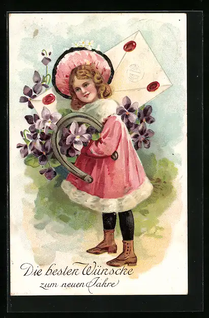 AK Neujahrswünsche, Mädchen mit Hufeisen und Veilchen