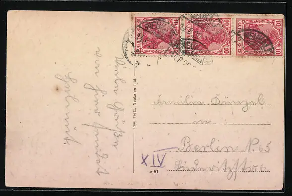 Personenbezogene Daten auf der Rückseite der Karte wurden durch blauen Textmarker unkenntlich gemacht. Die blauen Stellen sind auf die Vorderseite durchgeweicht und wirken sich negativ auf das Postkartenfoto aus