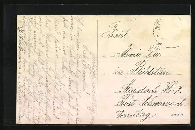 Personenbezogene Daten auf der Rückseite der Karte wurden durch blauen Textmarker unkenntlich gemacht. Die blauen Stellen sind auf die Vorderseite durchgeweicht und wirken sich negativ auf das Postkartenfoto aus