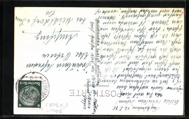 Personenbezogene Daten auf der Rückseite der Karte wurden durch blauen Textmarker unkenntlich gemacht. Die blauen Stellen sind auf die Vorderseite durchgeweicht und wirken sich negativ auf das Postkartenfoto aus