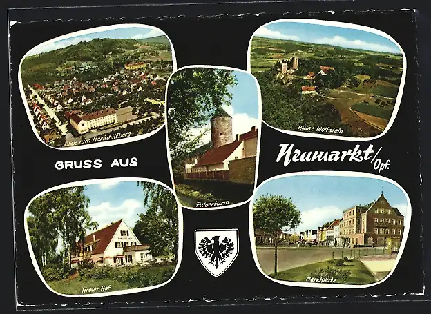 AK Neumarkt /Opf., Gasthaus Tiroler Hof, Ortsansicht aus der Vogelschau, Marktplatz