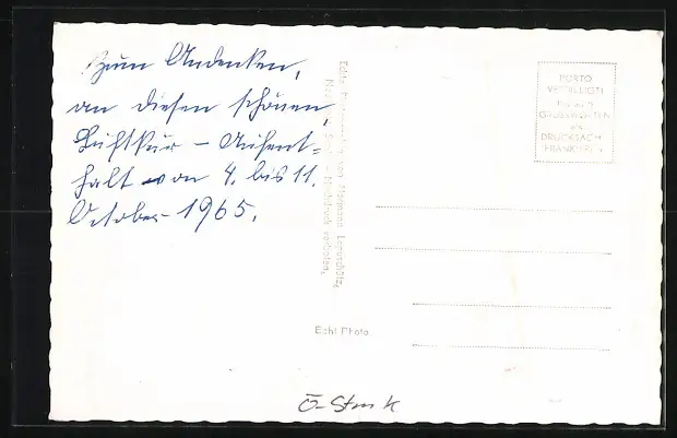 Personenbezogene Daten auf der Rückseite der Karte wurden durch blauen Textmarker unkenntlich gemacht. Die blauen Stellen sind auf die Vorderseite durchgeweicht und wirken sich negativ auf das Postkartenfoto aus