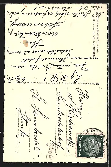 Personenbezogene Daten auf der Rückseite der Karte wurden durch blauen Textmarker unkenntlich gemacht. Die blauen Stellen sind auf die Vorderseite durchgeweicht und wirken sich negativ auf das Postkartenfoto aus