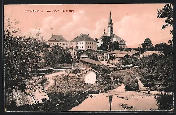 AK Neumarkt am Wallersee, Ortspartie mit Kirchturm