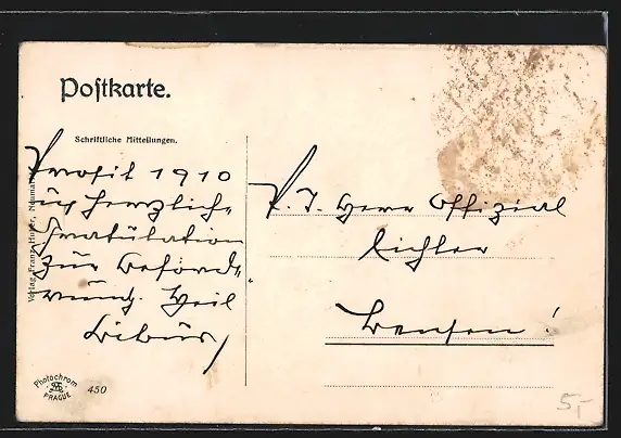 Personenbezogene Daten auf der Rückseite der Karte wurden durch blauen Textmarker unkenntlich gemacht. Die blauen Stellen sind auf die Vorderseite durchgeweicht und wirken sich negativ auf das Postkartenfoto aus