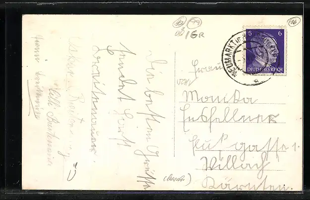 Personenbezogene Daten auf der Rückseite der Karte wurden durch blauen Textmarker unkenntlich gemacht. Die blauen Stellen sind auf die Vorderseite durchgeweicht und wirken sich negativ auf das Postkartenfoto aus