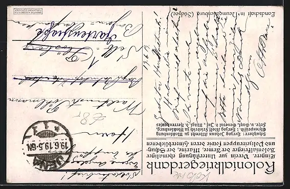 Personenbezogene Daten auf der Rückseite der Karte wurden durch blauen Textmarker unkenntlich gemacht. Die blauen Stellen sind auf die Vorderseite durchgeweicht und wirken sich negativ auf das Postkartenfoto aus