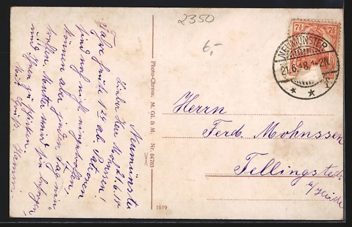 alte Ansichtskarte, gelaufen 1918, Bugspur links mittig, guter Zustand