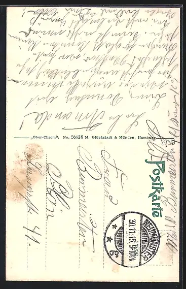 Personenbezogene Daten auf der Rückseite der Karte wurden durch blauen Textmarker unkenntlich gemacht. Die blauen Stellen sind auf die Vorderseite durchgeweicht und wirken sich negativ auf das Postkartenfoto aus