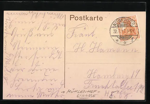 Personenbezogene Daten auf der Rückseite der Karte wurden durch blauen Textmarker unkenntlich gemacht. Die blauen Stellen sind auf die Vorderseite durchgeweicht und wirken sich negativ auf das Postkartenfoto aus