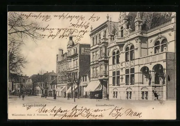 AK Neumünster, Strasse Grossflecken mit Geschäften