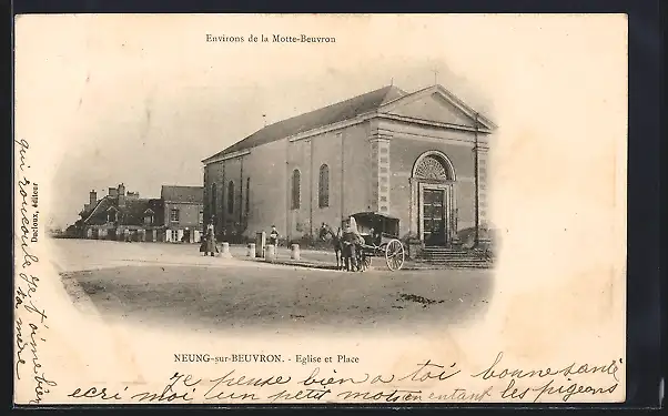 AK Neung-sur-Beuvron, Église et place avec calèche devant l`église