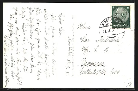 Personenbezogene Daten auf der Rückseite der Karte wurden durch blauen Textmarker unkenntlich gemacht. Die blauen Stellen sind auf die Vorderseite durchgeweicht und wirken sich negativ auf das Postkartenfoto aus