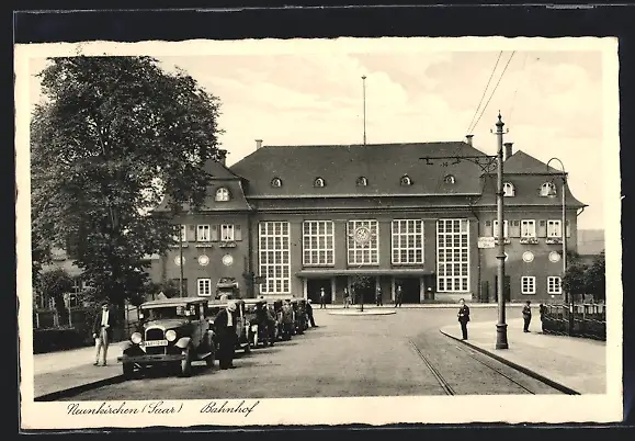 AK Neunkirchen /Saar, Taxidroschken vor dem Bahnhof