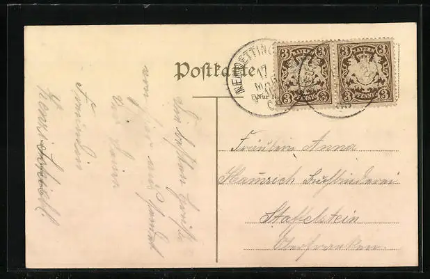 Personenbezogene Daten auf der Rückseite der Karte wurden durch blauen Textmarker unkenntlich gemacht. Die blauen Stellen sind auf die Vorderseite durchgeweicht und wirken sich negativ auf das Postkartenfoto aus