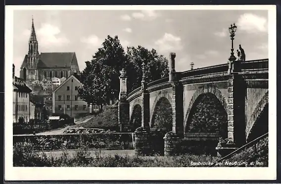 AK Neuötting am Inn, Innbrücke mit Strasse u. Kirche, Ortspartie
