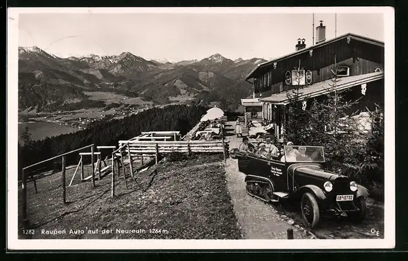 AK Neureuth, Ansicht mit Raupen-Auto und Bergpanorama
