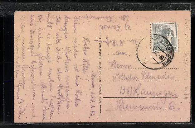 Personenbezogene Daten auf der Rückseite der Karte wurden durch blauen Textmarker unkenntlich gemacht. Die blauen Stellen sind auf die Vorderseite durchgeweicht und wirken sich negativ auf das Postkartenfoto aus