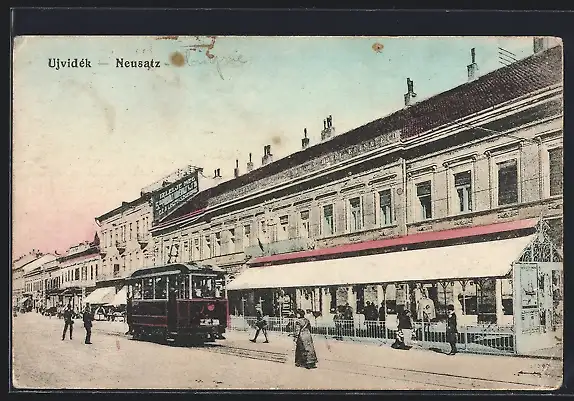 AK Neusatz, Strassenpartie mit Strassenbahn