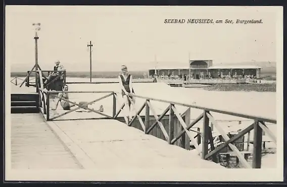 AK Neusiedl am See /Burgenland, Frau in Badeanzug auf einem Steg