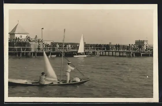 AK Neusiedl am See, Segelboote auf dem See, Zuschauer auf dem Seesteg, Seebad