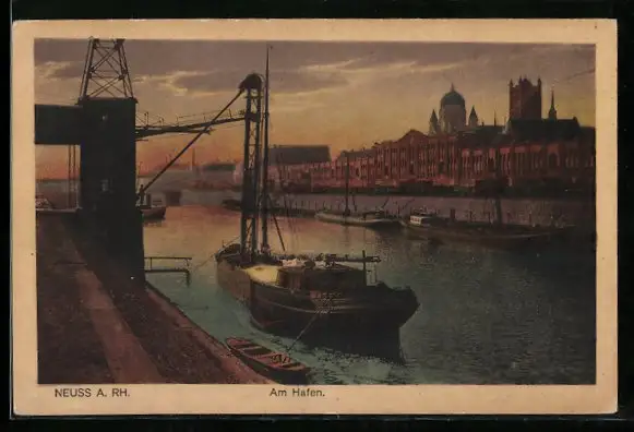 AK Neuss /Rh., Hafenpartie mit Frachter und Stadtpanorama