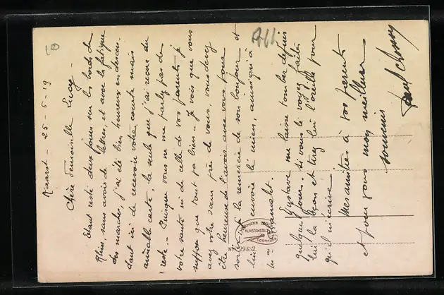 Personenbezogene Daten auf der Rückseite der Karte wurden durch blauen Textmarker unkenntlich gemacht. Die blauen Stellen sind auf die Vorderseite durchgeweicht und wirken sich negativ auf das Postkartenfoto aus