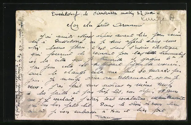 Personenbezogene Daten auf der Rückseite der Karte wurden durch blauen Textmarker unkenntlich gemacht. Die blauen Stellen sind auf die Vorderseite durchgeweicht und wirken sich negativ auf das Postkartenfoto aus
