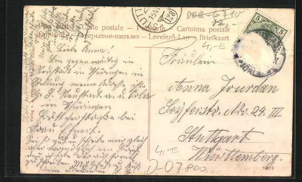alte Ansichtskarte, gelaufen, Briefmarke tw. entfernt, rückseitig Oberflächenschaden, Stempelspur, guter Zustand