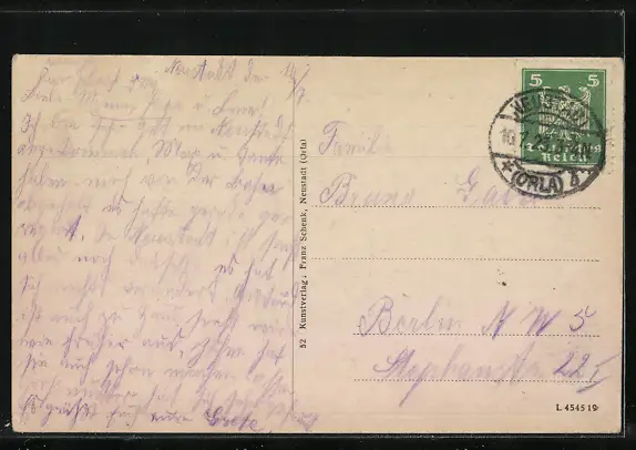 Personenbezogene Daten auf der Rückseite der Karte wurden durch blauen Textmarker unkenntlich gemacht. Die blauen Stellen sind auf die Vorderseite durchgeweicht und wirken sich negativ auf das Postkartenfoto aus