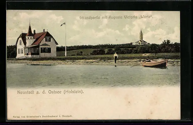 AK Neustadt /Ostsee, Strandpartie mit Auguste Victoria Warte und Kirche